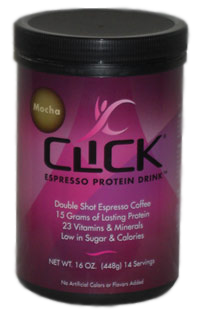 Click Espresso Protein Drink is the all-in-one energy drink with a rich mocha flavor. It contains 23 vitamins and minerals, a double shot of espresso, 15g protein, and 120 calories in a 12 oz. serving. No artificial colors or flavors. Click is a tasty alternative to sugary coffee and energy drinks. Caffeine = 12-14 oz. brewed coffee.